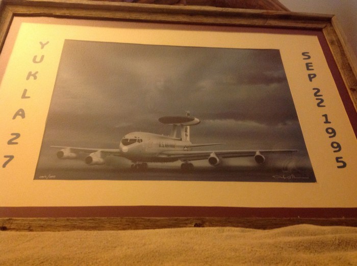The painting below is of one of the planes that was stationed in Alaska. This plane was lost with the entire crew of 24 people on board. Birds flew into the two engines of the plane and on take off it crashed into the side of one of the mountains at the end of the runway. This painting is precious to us because although you can ‘t see, each member of the crew’s name is in the clouds. There is also an angel with her hand over the plane. Yukla 27 was the call sign for the plane and it was lost on 9/22/1995.