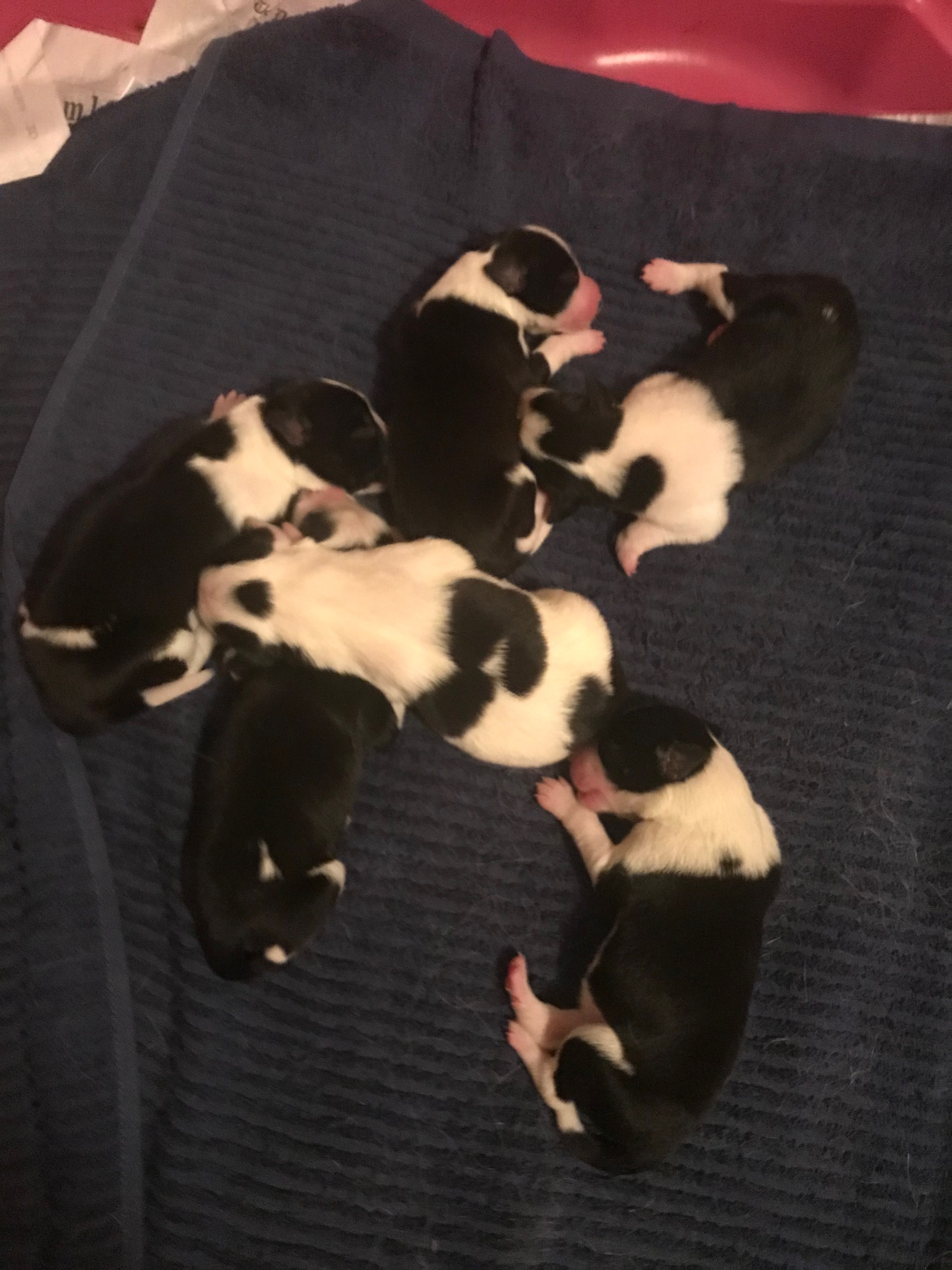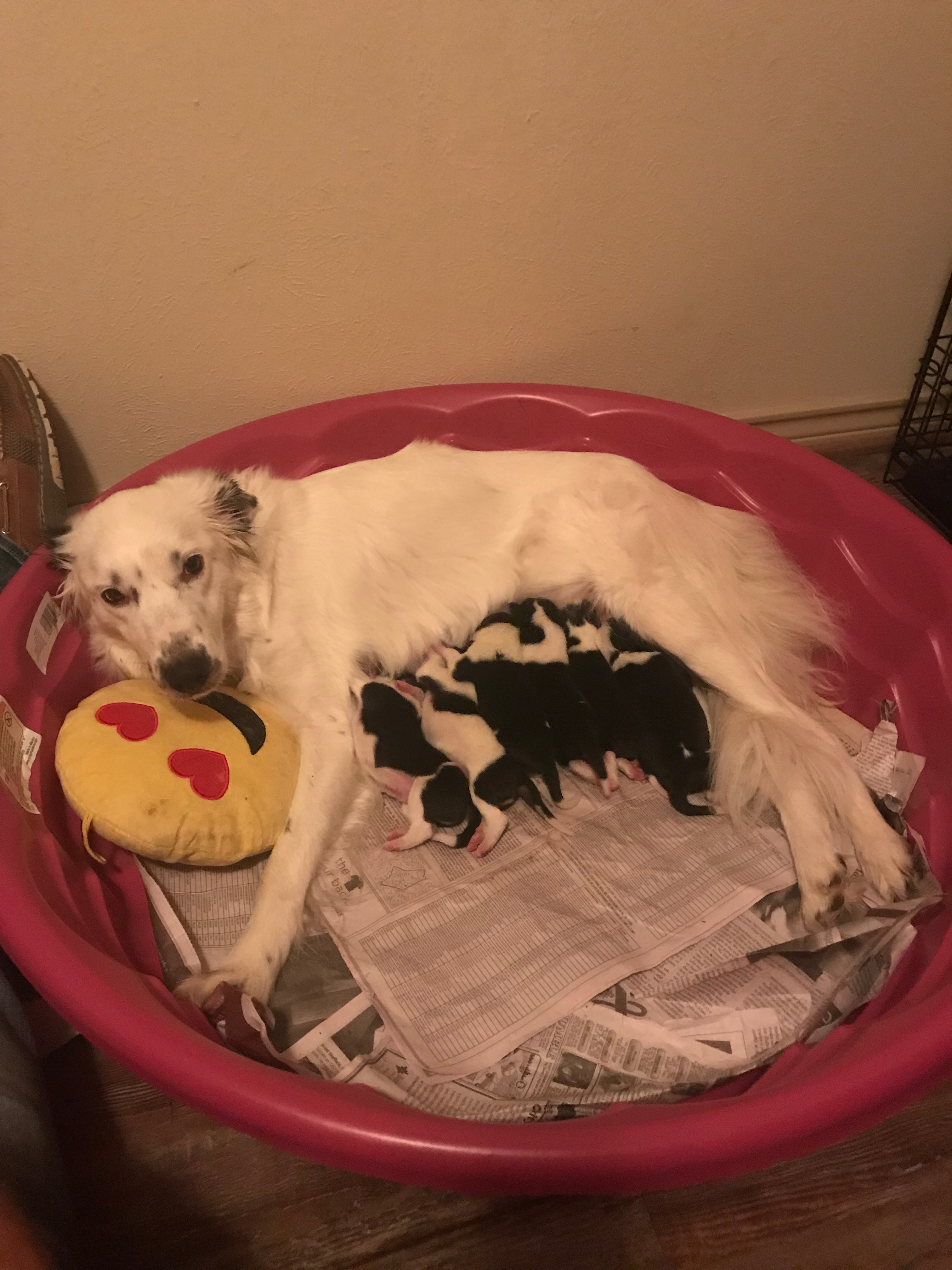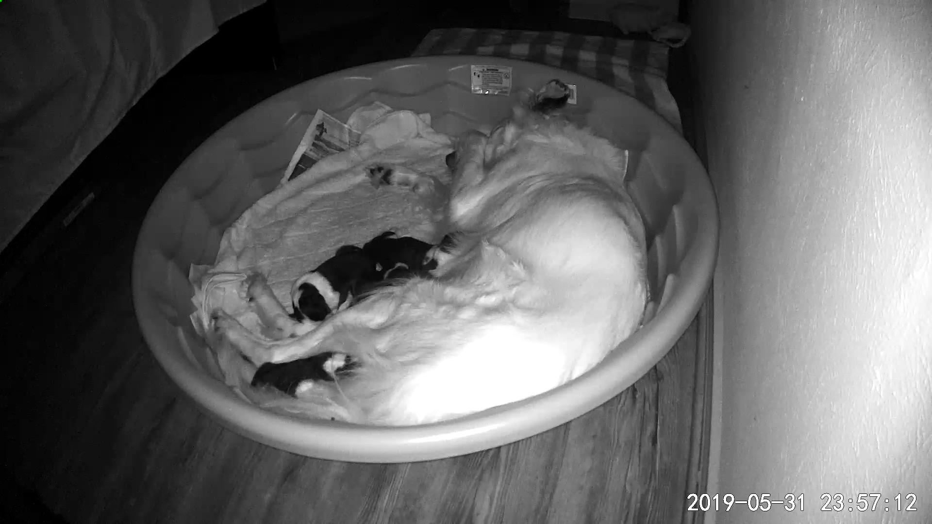 While she is off enjoying the trip of a lifetime, she and her husband have me watching their precious pup who was about to become a mom. We knew Sadie, the pup (granddog), was due sometime around the first of June. So last Thursday, after buying and installing a camera to monitor her from work, we began having puppies. Sadie did awesome. For a first time mom, she did absolutely perfect. We had six bouncing baby girls and one boy.